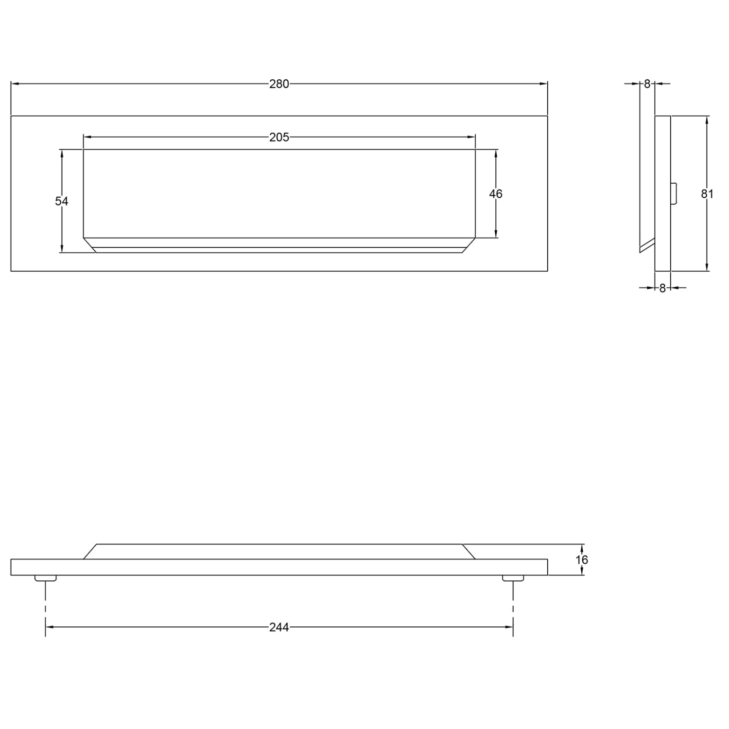 For more details and measurements of the gravity letter plate, please see the PDF drawing in the Dimensions tab. See also the co-ordinating Letter Plate Tidy for the internal side of the door.