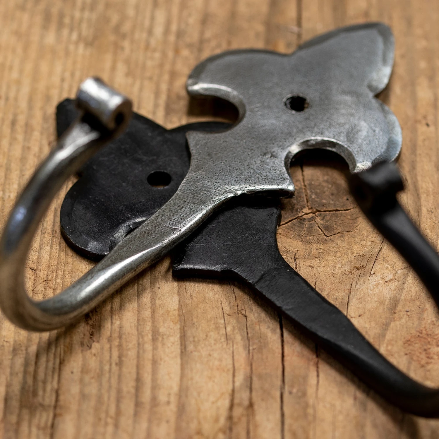 Please note: The black fleur de lis hook has a layer of natural beeswax, which is used as a natural protective layer. Beeswax can be sticky to touch. Any excess wax can be removed with a mild solvent and a soft cloth. Maintain the hand forged hook with an occasional rub of beeswax.
