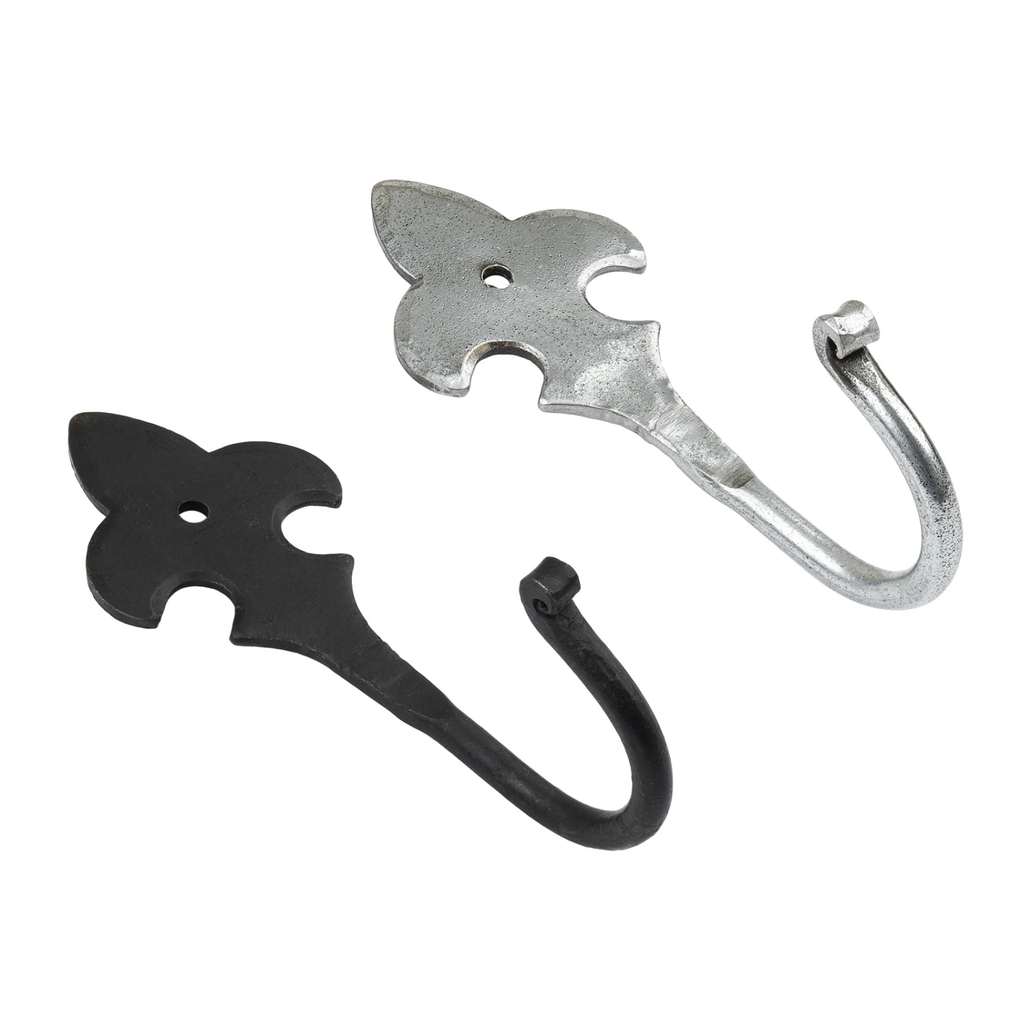The hand forged hooks are crafted from mild steel and available in a choice of classic black beeswax or pewter patina finishes. Why not co-ordinate with our black and pewter Hand Forged Hinges and Latches. See also our Fleur de Lis Lever Handles.